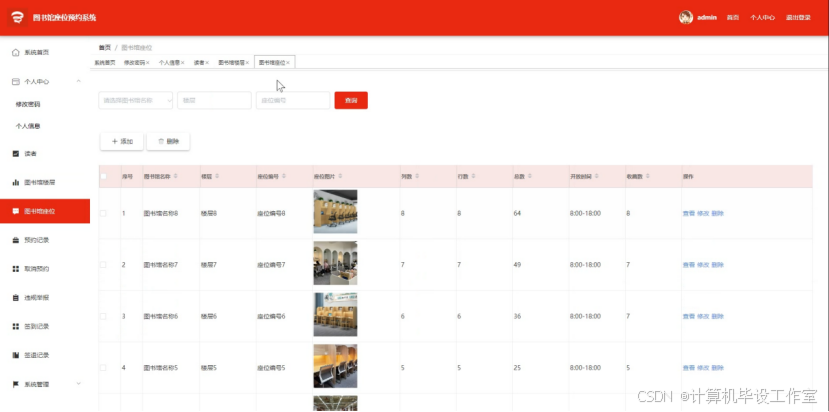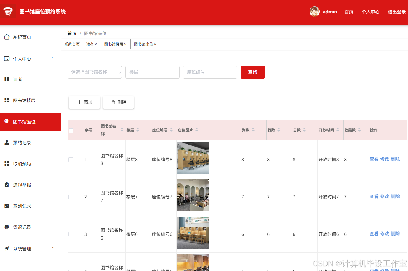 管理员可以通过图书馆座位模块,查看系统的座位信息列表和详情,可进行修改、删除和添加操作。