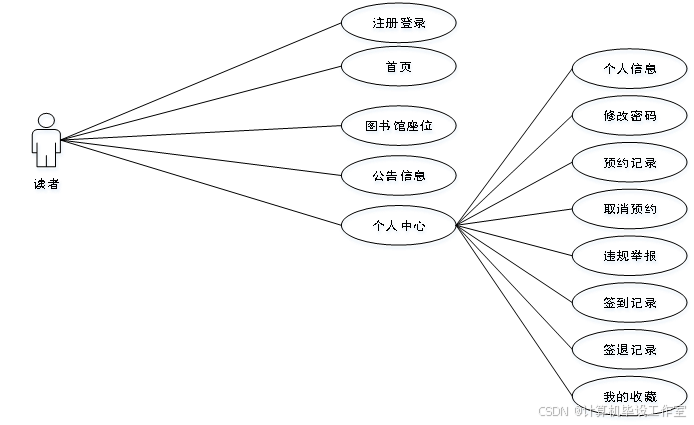 游客需先在系统前台进行注册创建个人账户,注册完成后方可登录,在首页界面可以浏览各种功能模块;查看公告信息,可对内容点赞和收藏;查看以及搜索图书馆座位,可以点赞和收藏,可以点击预约按钮,选择预约日期、时间段和位置等即可提交座位预约;在个人中心,可以对个人信息和密码进行修改更新;在预约记录可以查看自己的预约信息,进行取消预约、违规举报和签到操作;可以在违规举报查看自己提交的举报记录信息,可以进行修改和删除;在签到记录可以查看自己的签到信息,还可进行签退信息的提交;点击我的收藏可查看自己收藏的公告信息和图书馆座位,可点击跳转至原文,也可进行删除操作。读者用例图如图3-1所示。