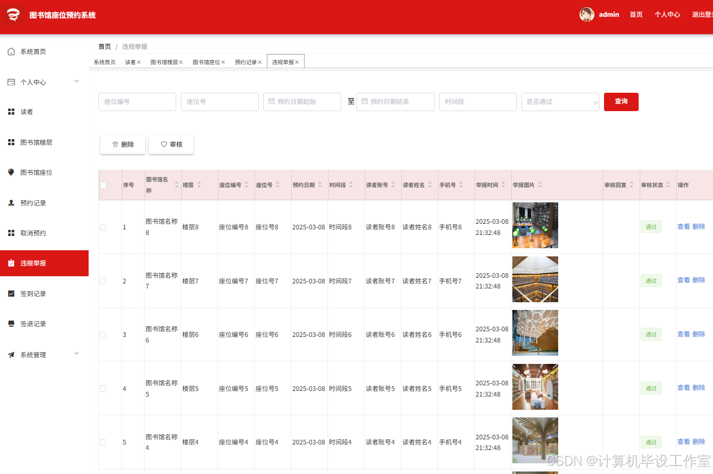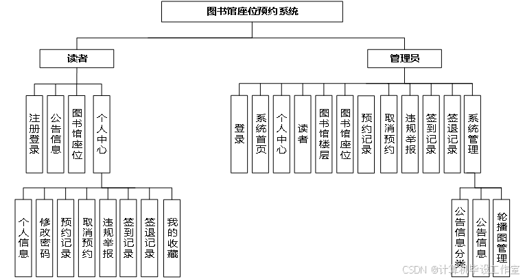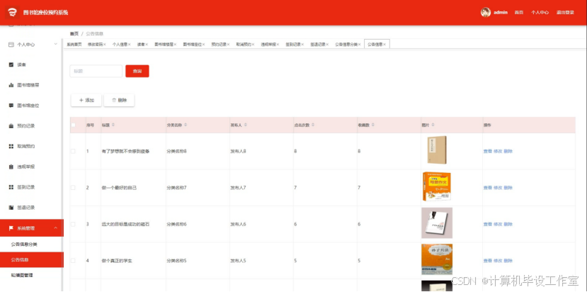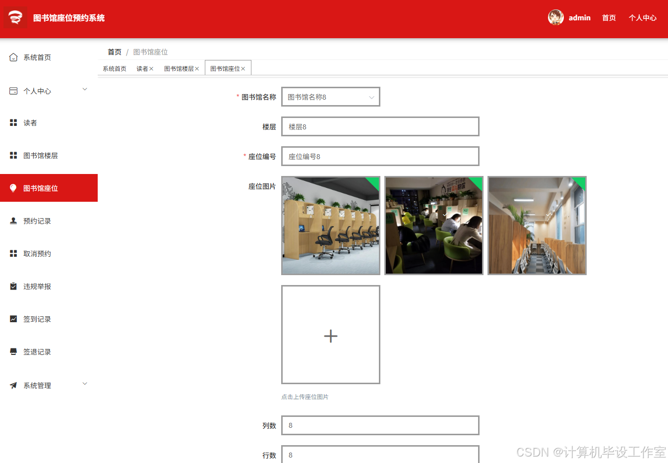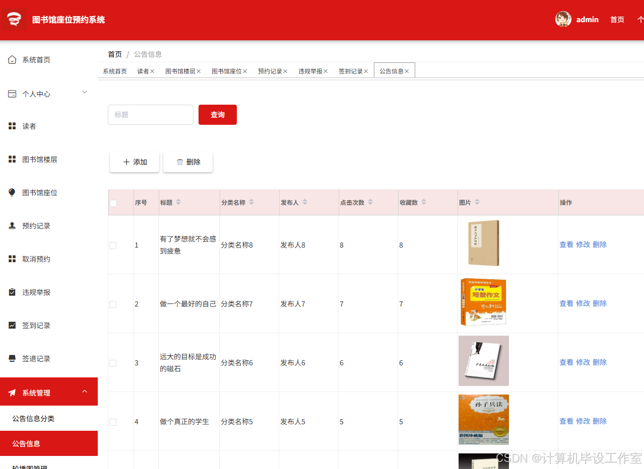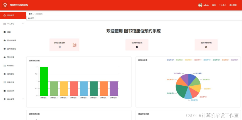 管理员登录系统后台,可在系统首页进行数据总览,包含预约记录总数、取消预约总数和违规举报总数,以及读者预约次数、座位占坐率、读者取消次数和读者举报次数图表,可在个人中心对个人信息和密码进行修改更新;有权限对读者信息进行添加、修改以及删除操作;查看、管理图书馆楼层、图书馆座位、预约记录、取消预约、违规举报、签到记录、签退记录,以及在系统管理可对公告信息分类、公告信息和轮播图管理进行增删改查操作。