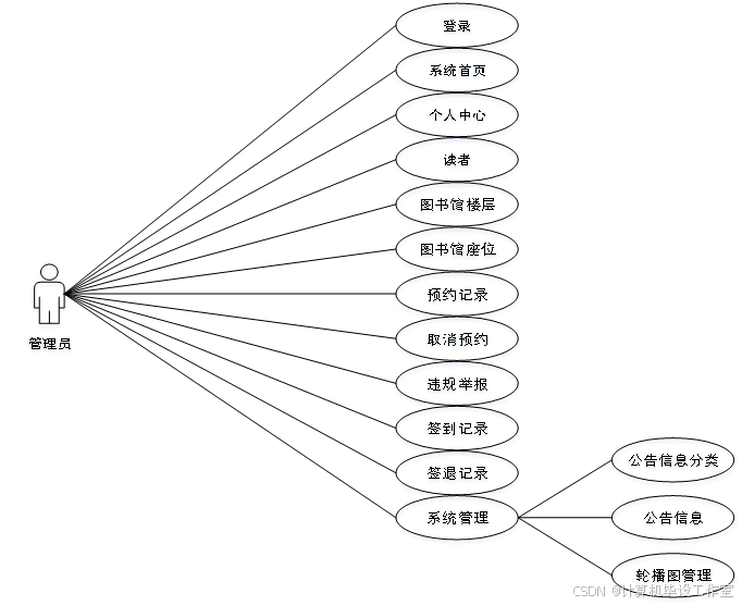管理员登录系统后台,可在系统首页进行数据总览,包含预约记录总数、取消预约总数和违规举报总数,以及读者预约次数、座位占坐率、读者取消次数和读者举报次数图表,可在个人中心对个人信息和密码进行修改更新;有权限对读者信息进行添加、修改以及删除操作;查看、管理图书馆楼层、图书馆座位、预约记录、取消预约、违规举报、签到记录、签退记录,以及在系统管理可对公告信息分类、公告信息和轮播图管理进行增删改查操作。管理员用例图如图3-2所示。