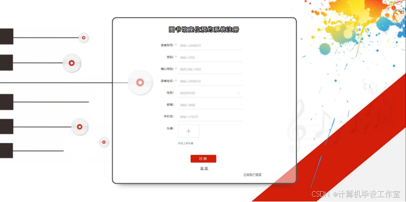 游客可以在图书馆座位预约系统界面中点击注册按钮,对应输入读者账户、密码、确认密码、姓名、性别、手机号码、头像等信息进行注册,注册成功后可以凭账户和密码进行登录使用该系统。