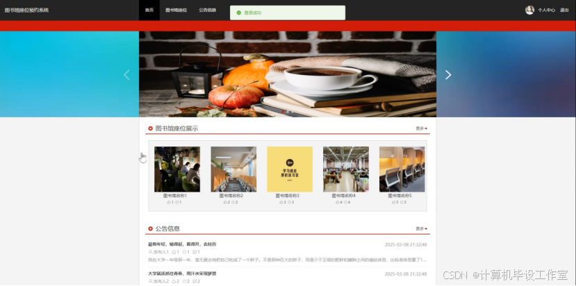 登录成功后,读者进入首页模块,首页主要展示轮播图以及各大功能板块,功能导航栏在系统界面直上方,读者可见公告信息、图书馆座位展示。