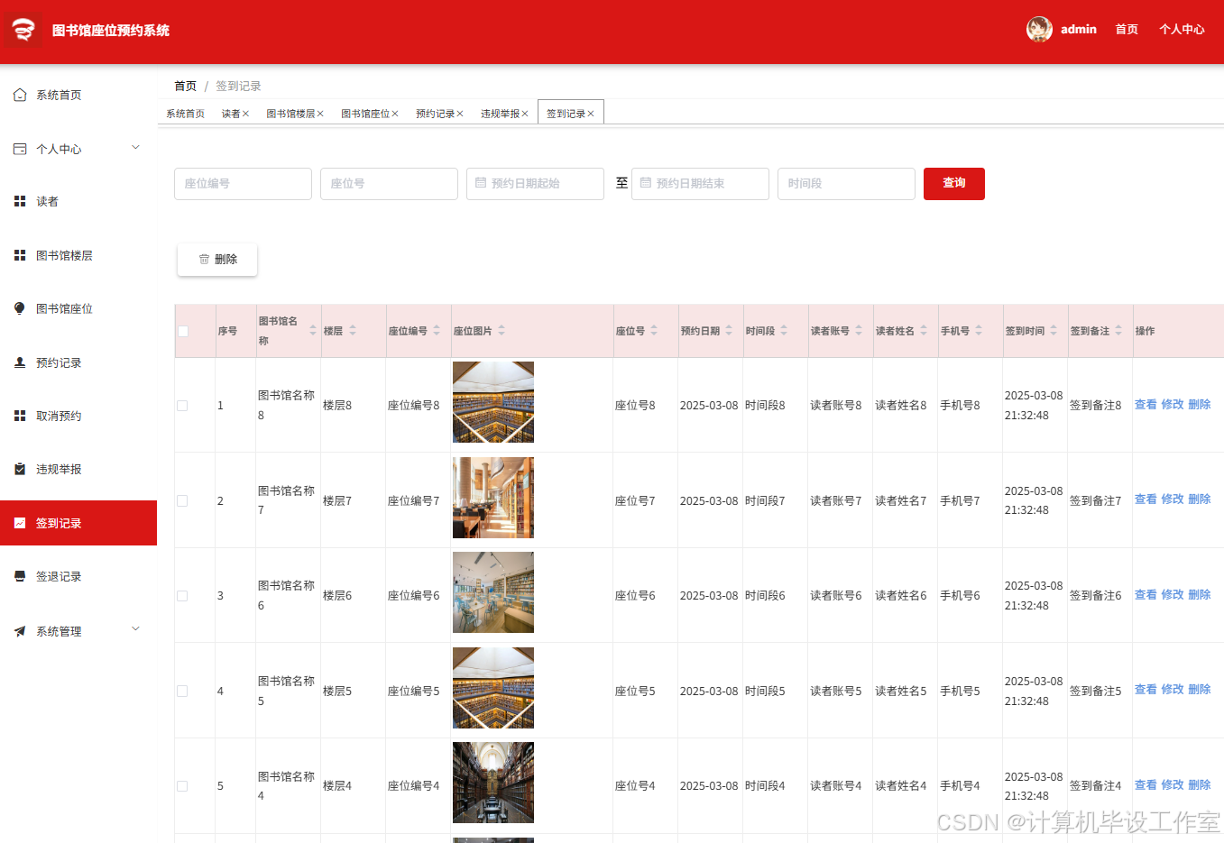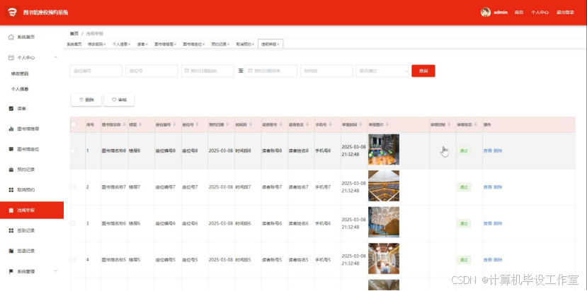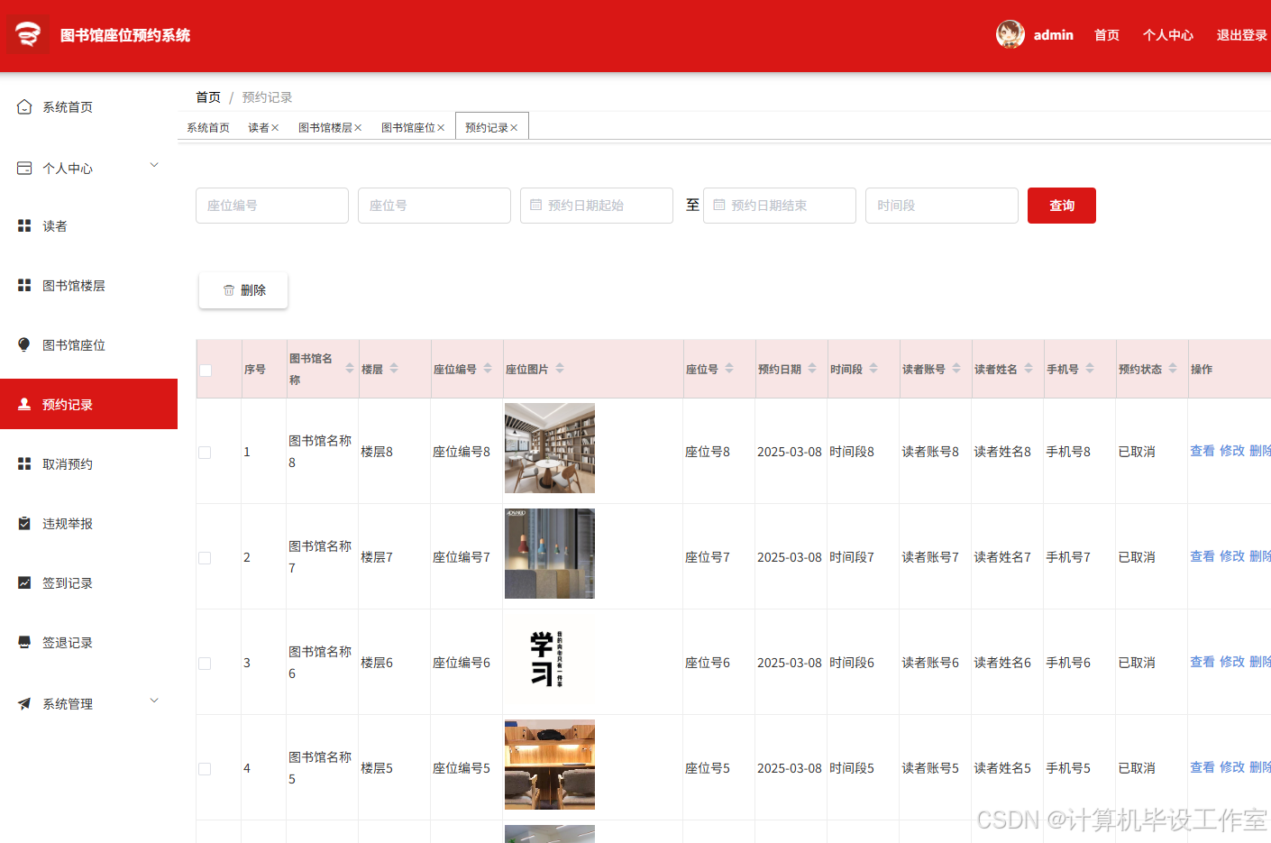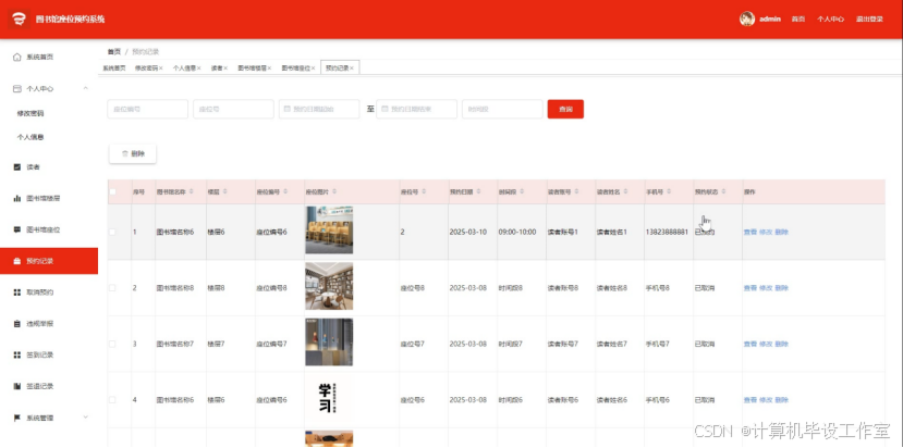 管理员可以通过预约记录模块,查看读者提交的座位预约列表和详情,可进行修改和删除操作。