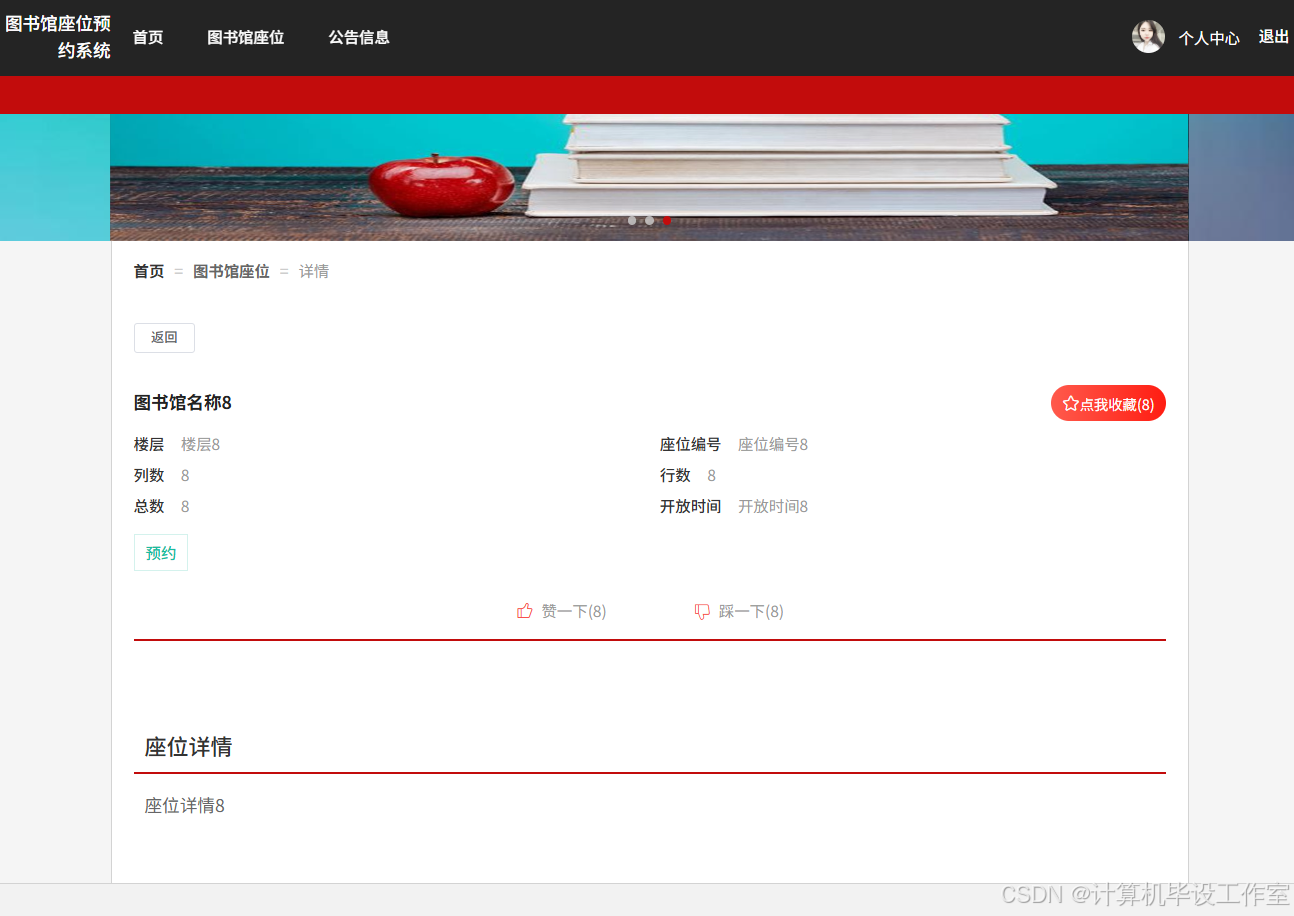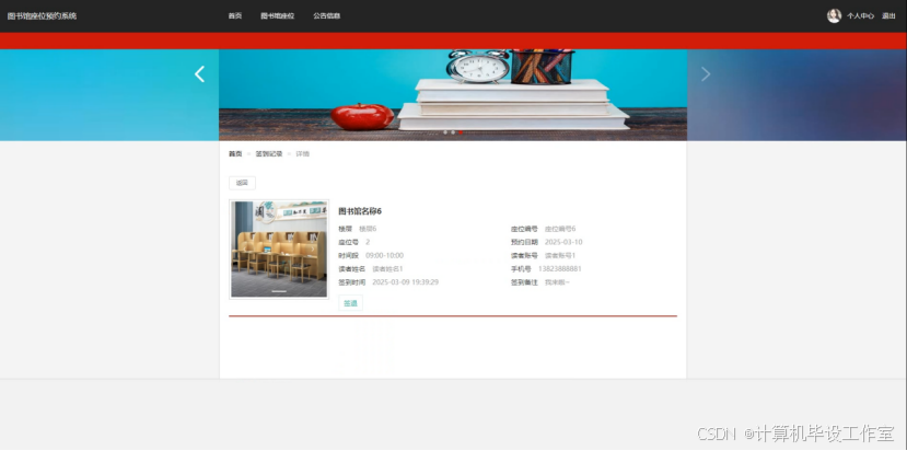 对于读者而言,通过本系统,读者可以在线浏览、搜索并精确预约图书馆的座位,选择特定日期和时间段进行预约,无需担心到达后无位可坐的问题。同时,系统提供的实时座位信息功能,让读者能够清晰了解图书馆的座位使用情况,从而做出更加合理的选择。这不仅提高了读者的学习效率,也增强了读者对图书馆的满意度和信任感。