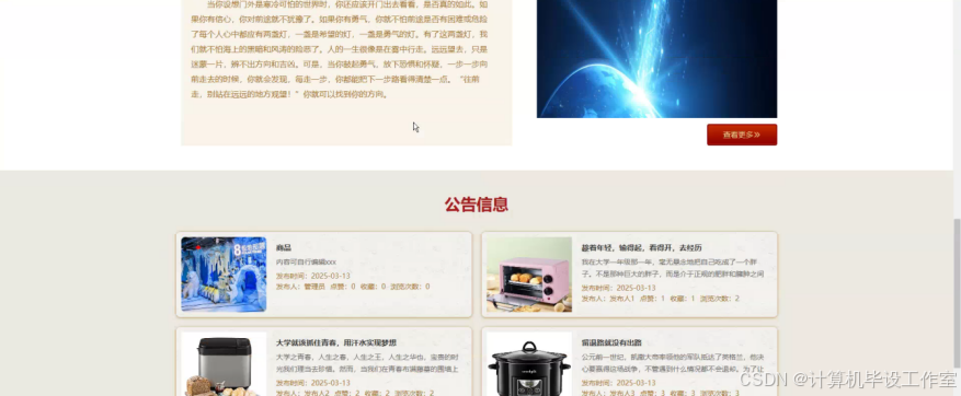 管理员可对首页的轮播图、公告信息、系统简介内容等进行管理,进行增删改查操作,支持标题搜索,对公告内容进行发布。