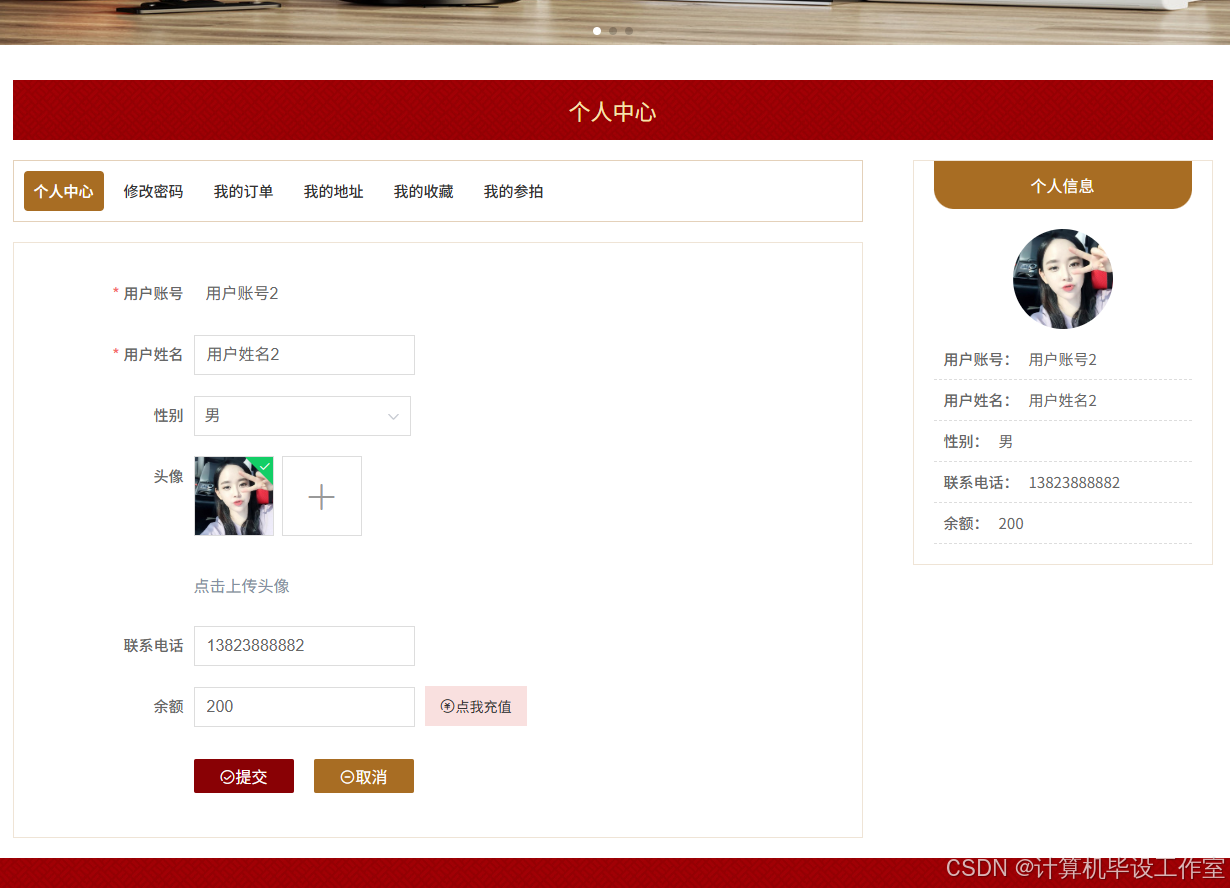 例如,普通用户可以在个人中心进行个人资料和密码进行修改操作,界面图如下所示。