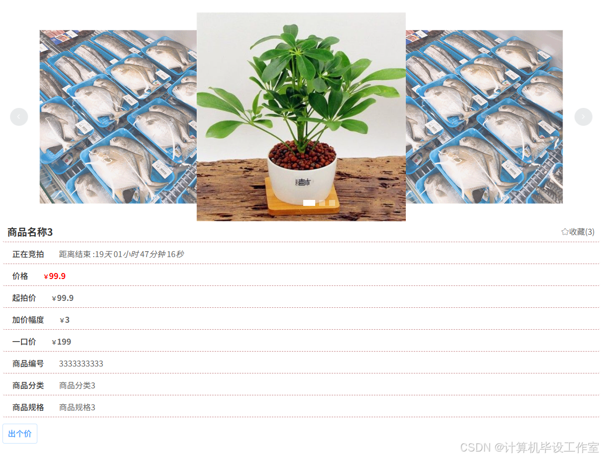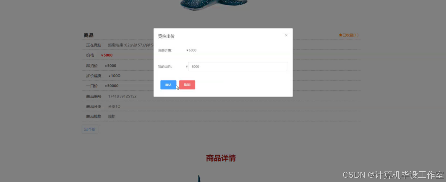 普通用户可选择某个商品详情界面点击查看,具体了解竞拍商品的价格以及起拍金额,可以参与竞拍操作。