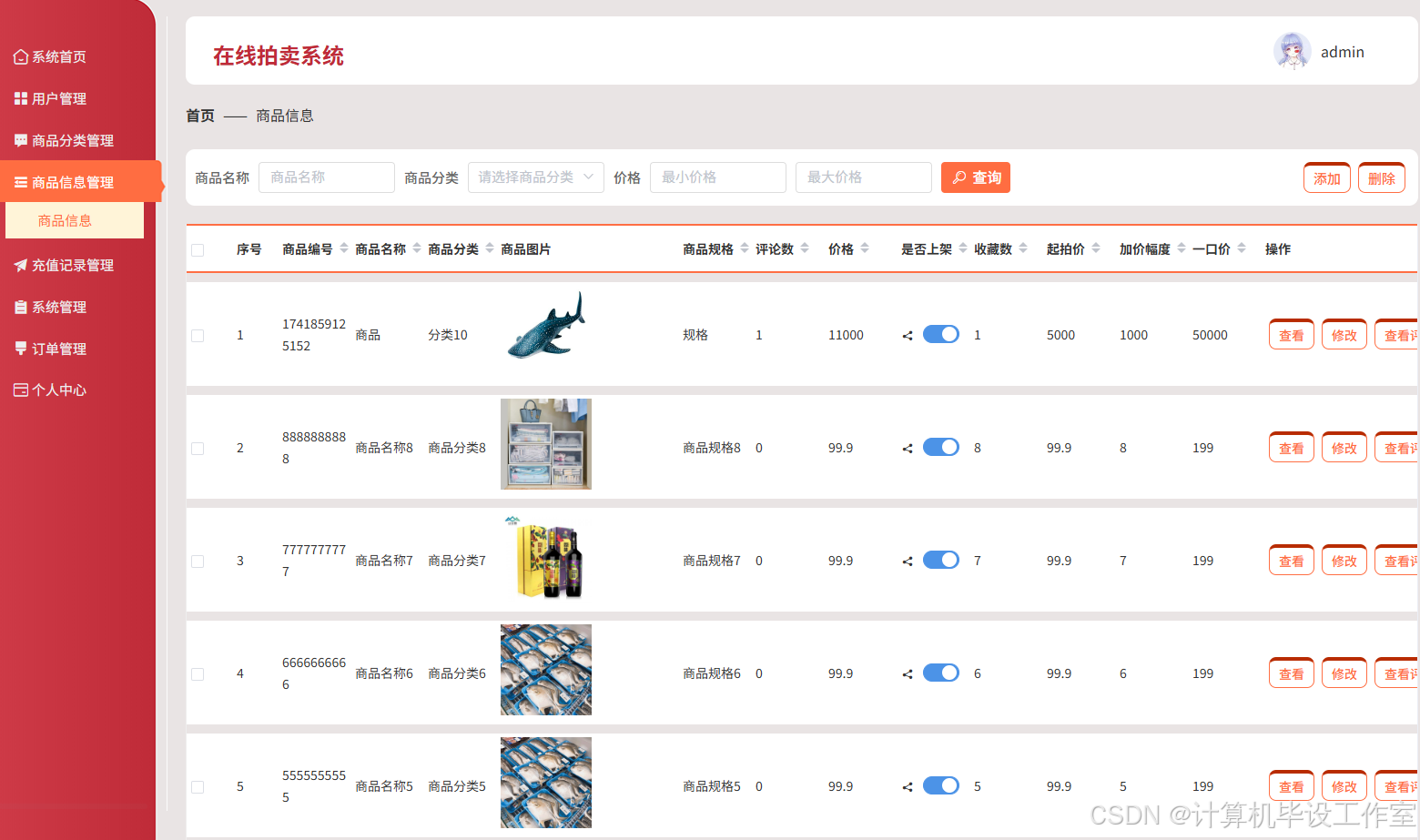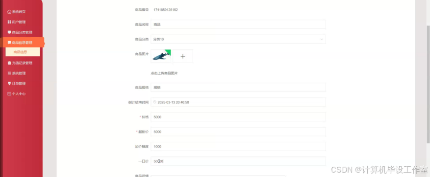 管理员可以在此模块添加、编辑或删除待售商品的信息,包括上传图片、填写描述、设定起拍价或者一口价和结束时间等,确保拍卖品信息准确无误,新增的竞拍商品才可以被上传至前台。