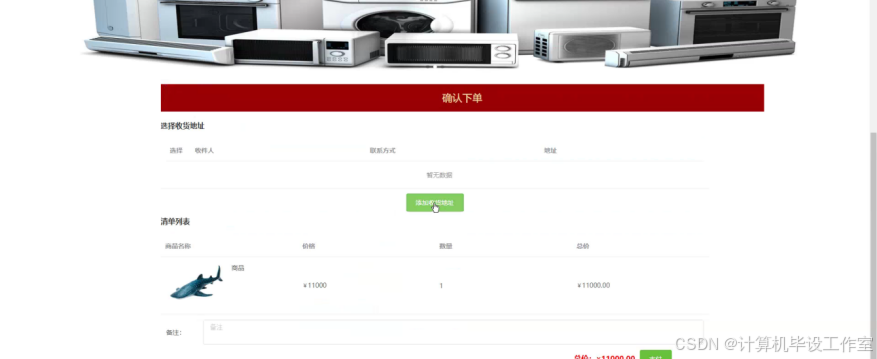 用户在界面中的我的订单页面可以进行下单操作,核对商品信息以及价格后提交进行支付,可以在我的地址界面编辑和保存个人的收货地址信息。