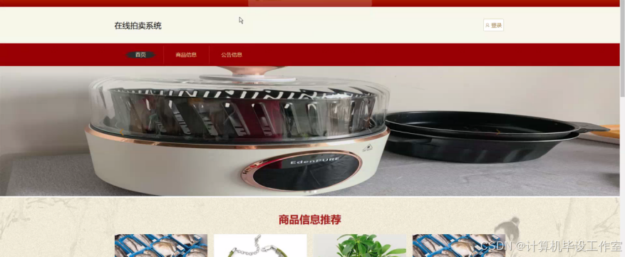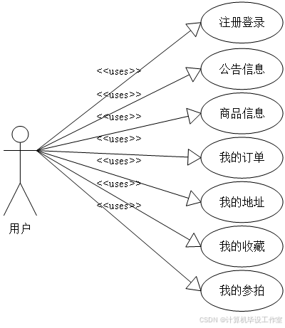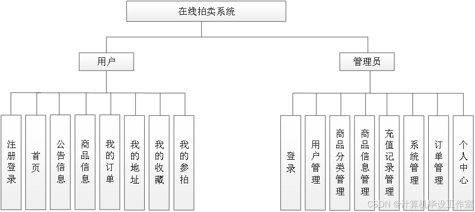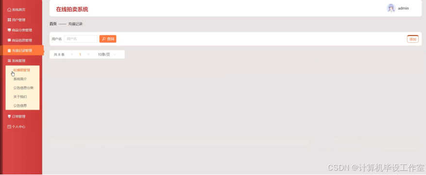 系统前台端:系统前台主要给用户使用主要包括注册登录、首页、公告信息、商品信息、我的订单、我的地址、我的收藏、我的参拍等功能。