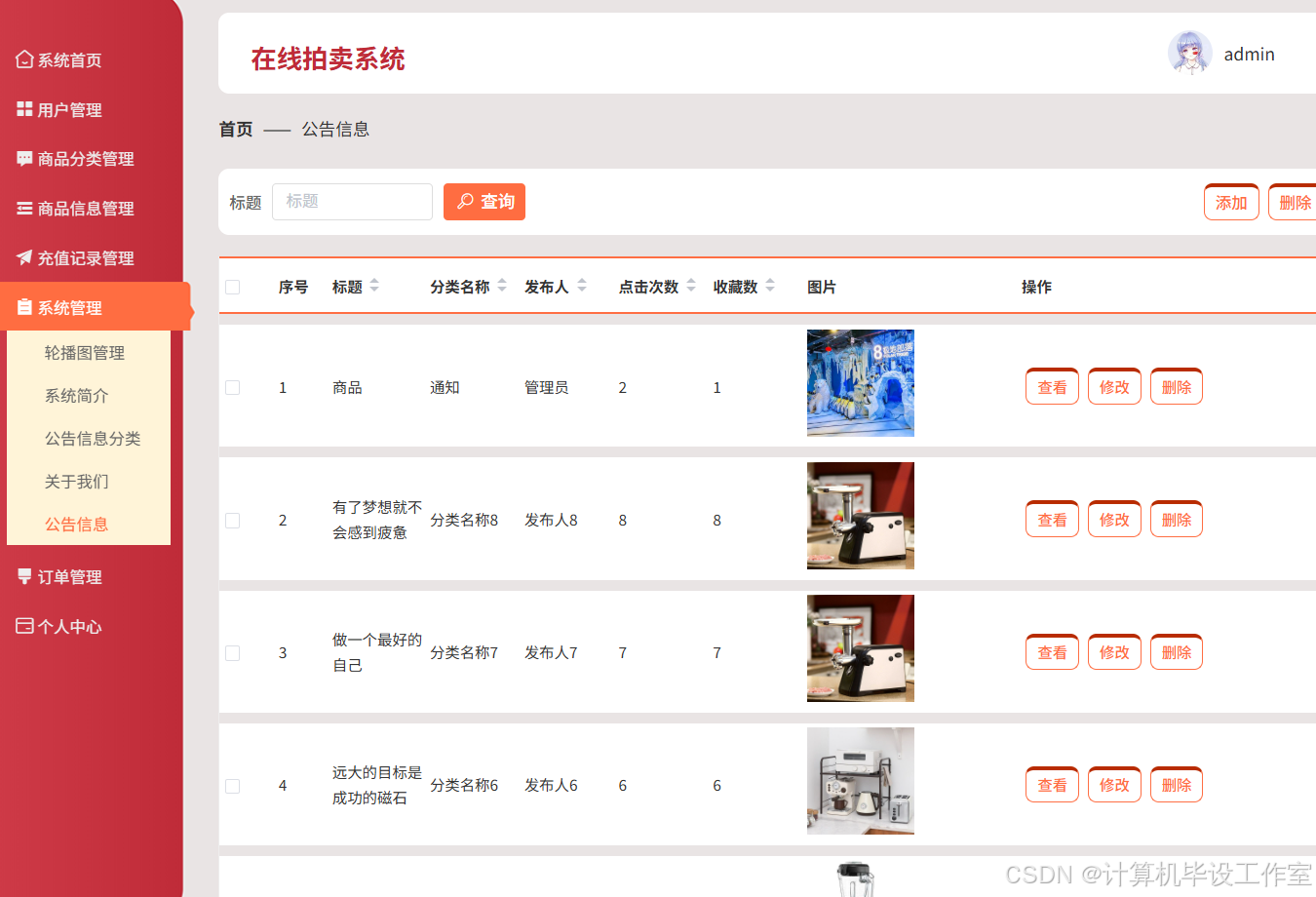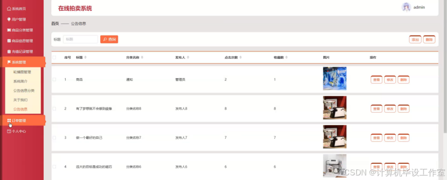 网络拍卖是一种基于互联网技术的电子商务平台,允许买卖双方通过在线竞拍的方式进行商品或服务的交易。对于卖家而言,在线拍卖系统提供了广泛的市场覆盖,使得他们能够触及更多的潜在买家,增加销售机会。而对于买家来说,这种系统打破了地域限制,使他们可以随时随地参与竞拍,获取心仪的商品。系统实现包含多项关键功能,涵盖公告信息、商品信息、商品分类、订单管理等。通过使用Spring Boot技术框架,实现了快速开发和灵活部署的优势,以及MySQL数据库管理数据持久化与安全性,能够有效支持系统功能的实现与扩展。