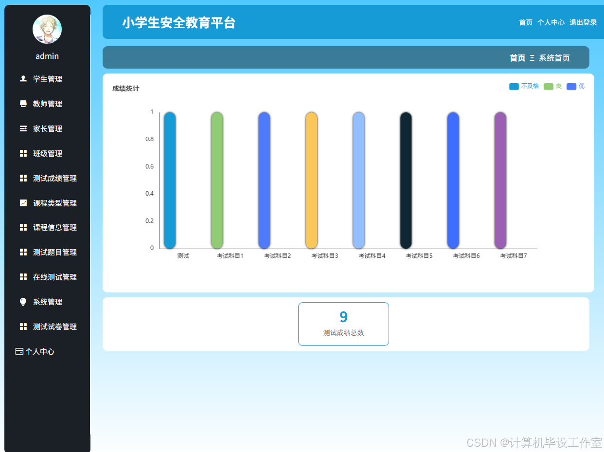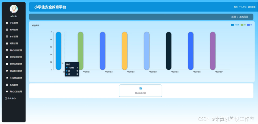 管理员和教师登录系统后台时,进入系统首页界面,可以查看各考试科目的成绩统计图和测试成绩总数,便于快速了解学生参与在线测试的成绩情况。