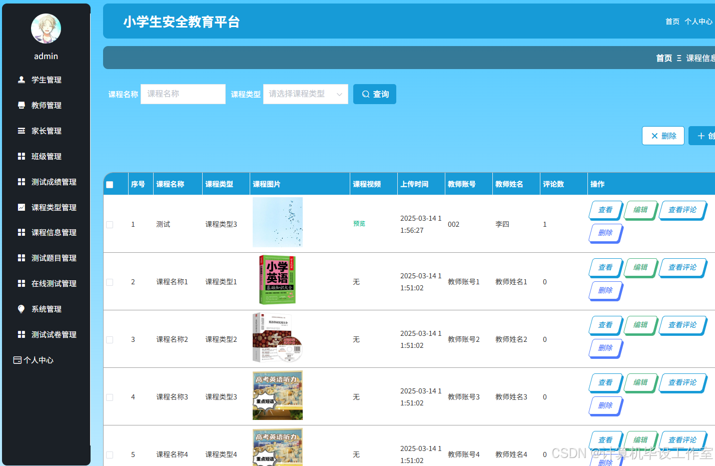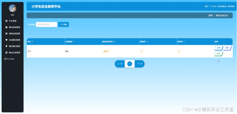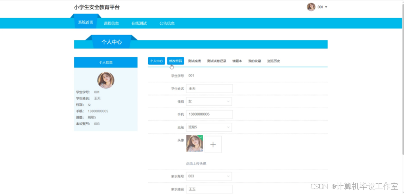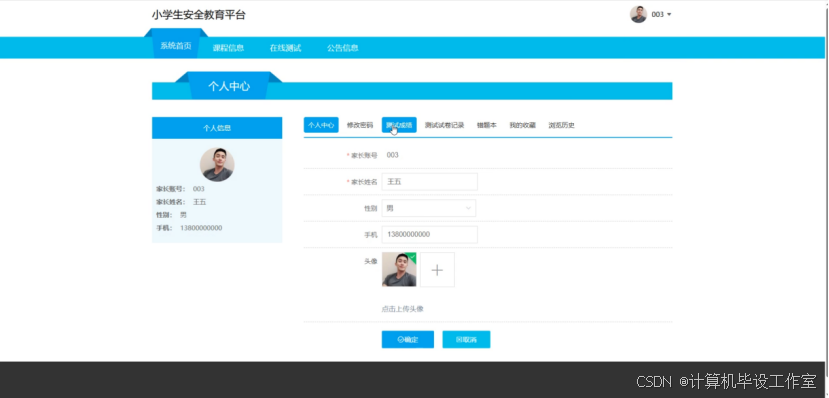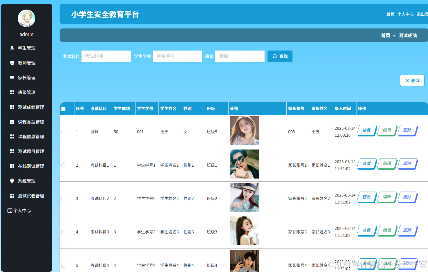 管理员登录后,可在系统首页查看各考试科目的成绩统计图,在个人中心修改个人信息和密码;有权限对系统所有用户信息进行查看、添加、修改以及删除操作,包含学生、家长和教师;可以查看、添加和管理班级;可以查看、管理系统所有学生的测试成绩;可对系统中的课程类型、课程信息、测试题目、在线测试进行增删改查操作;在系统管理模块中可以查看和编辑轮播图图片和链接,也可对公告信息和公告信息分类进行增删改查操作;在测试试卷管理中管理员可以查看、管理学生的测试试卷记录,也可查看教师创建的在线测试内容。