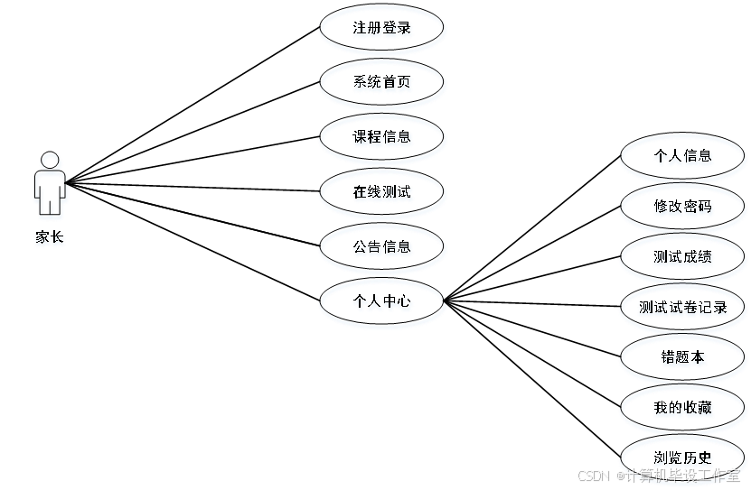 家长可以在系统前台进行注册创建个人账户,注册完成后可根据账号密码登录系统前台使用相关功能操作;查看课程信息、在线测试和公告信息;在个人中心可以对个人信息和登录密码进行修改;可以查看自己孩子的测试成绩、测试试卷记录和错题本;点击我的收藏可查看自己收藏的内容,可点击跳转至原文,也可进行删除操作;在浏览历史可查看学习记录。家长用例图如图3-2所示。