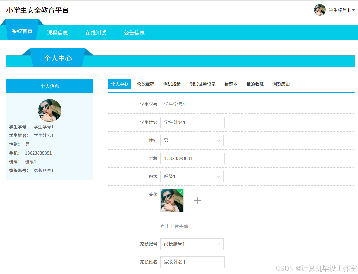 学生可以在系统前台进行注册创建个人账户,注册完成后可根据账号密码登录系统前台使用相关功能操作;在首页界面可以浏览各种功能模块;查看课程信息列表,可按课程名称、课程类型进行查询,查看课程详情,在线观看课程视频,可进行评论操作;在线测试,则允许学生在线进行测试,答题完成后提交可查看解析和分数;可以查看公告信息;在个人中心,可以对个人信息和登录密码进行修改;可以查看自己的测试成绩、测试试卷记录和错题本;点击我的收藏可查看自己收藏的内容,可点击跳转至原文,也可进行删除操作;在浏览历史可查看自己的学习记录。(2)家长功能