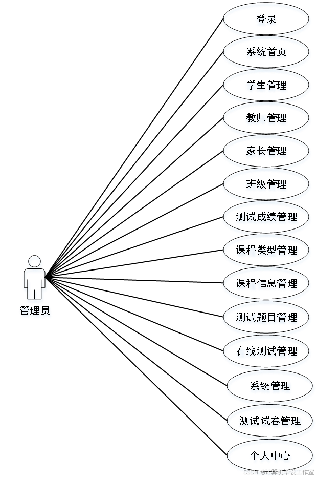 管理员登录后,可在系统首页查看各考试科目的成绩统计图,在个人中心修改个人信息和密码;有权限对系统所有用户信息进行查看、添加、修改以及删除操作,包含学生、家长和教师;可以查看、添加和管理班级;可以查看、管理系统所有学生的测试成绩;可对系统中的课程类型、课程信息、测试题目、在线测试进行增删改查操作;在系统管理模块中可以查看和编辑轮播图图片和链接,也可对公告信息和公告信息分类进行增删改查操作;在测试试卷管理中管理员可以查看、管理学生的测试试卷记录,也可查看教师创建的在线测试内容。管理员用例图如图3-4所示。