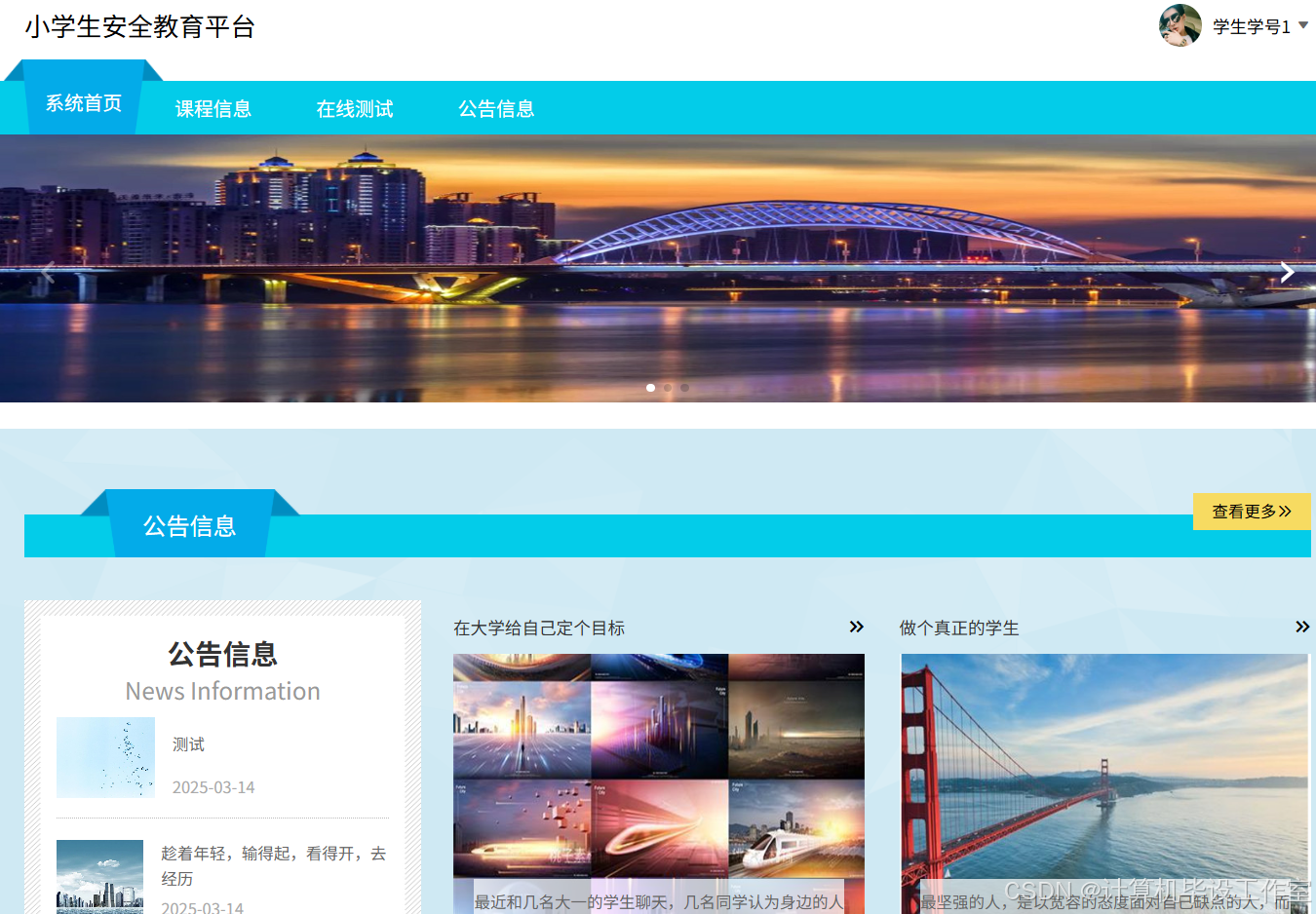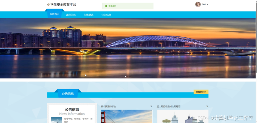 前台用户包含学生和家长,通过注册后可登录系统前台,进入首页模块,首页主要展示轮播图以及各大功能板块,功能导航栏在系统界面直上方,可见课程信息、在线测试和公告信息模块。
