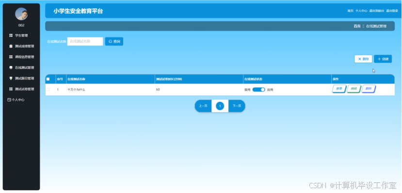 教师在在线测试进行管理模块,可以对测试信息进行查看、编辑和删除操作,也可修改在线测试状态(禁用/启用),另外可根据需求填写在线测试名称、测试试卷时长(分钟)和在线测试状态,创建新的在线测试。管理员也具有查看、创建和管理的功能。