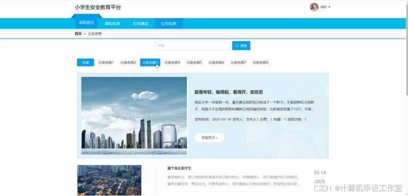 公告信息模块允许前台用户查看系统发布的公告信息列表,可按标题、分类进行搜索,点击图片查看详情,可以对内容进行点赞和收藏操作。