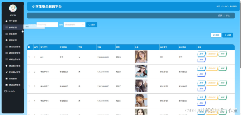 管理员可以通过对系统所有用户进行增、删、改、查等操作,包含学生、家长和教师。教师则可以通过学生管理模块,查看学生账号信息和录入学生测试成绩。