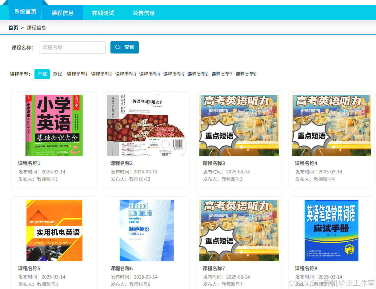 课程信息详情模块允许学生和家长浏览课程信息列表,可以按课程名称、课程类型进行查询,点击图片查看课程详情,可在线观看课程视频,可进行评论操作。