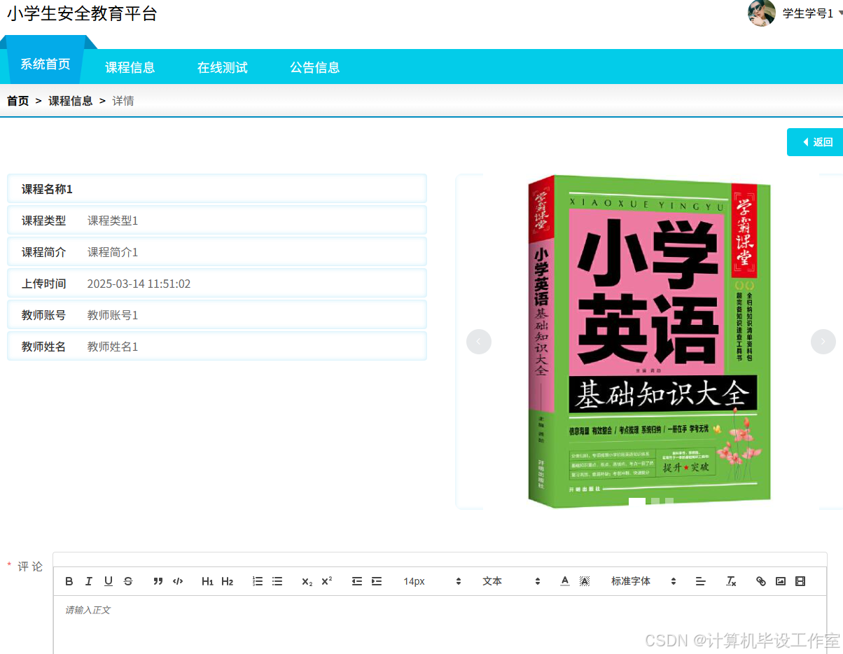 平台利用Spring Boot框架快速构建稳定的服务端应用,Vue.js提供了灵活且响应迅速的用户界面,MySQL确保了数据的安全存储与高效访问。实现了包括管理员、教师、家长和学生在内的多角色功能模块。学生可在线进行课程信息学习、参与在线测试、查看错题本、成绩和解析等;家长能同步掌握孩子学习动态;教师可高效管理课程、测试与成绩等;管理员则负责统筹用户、班级、资源及系统配置等。