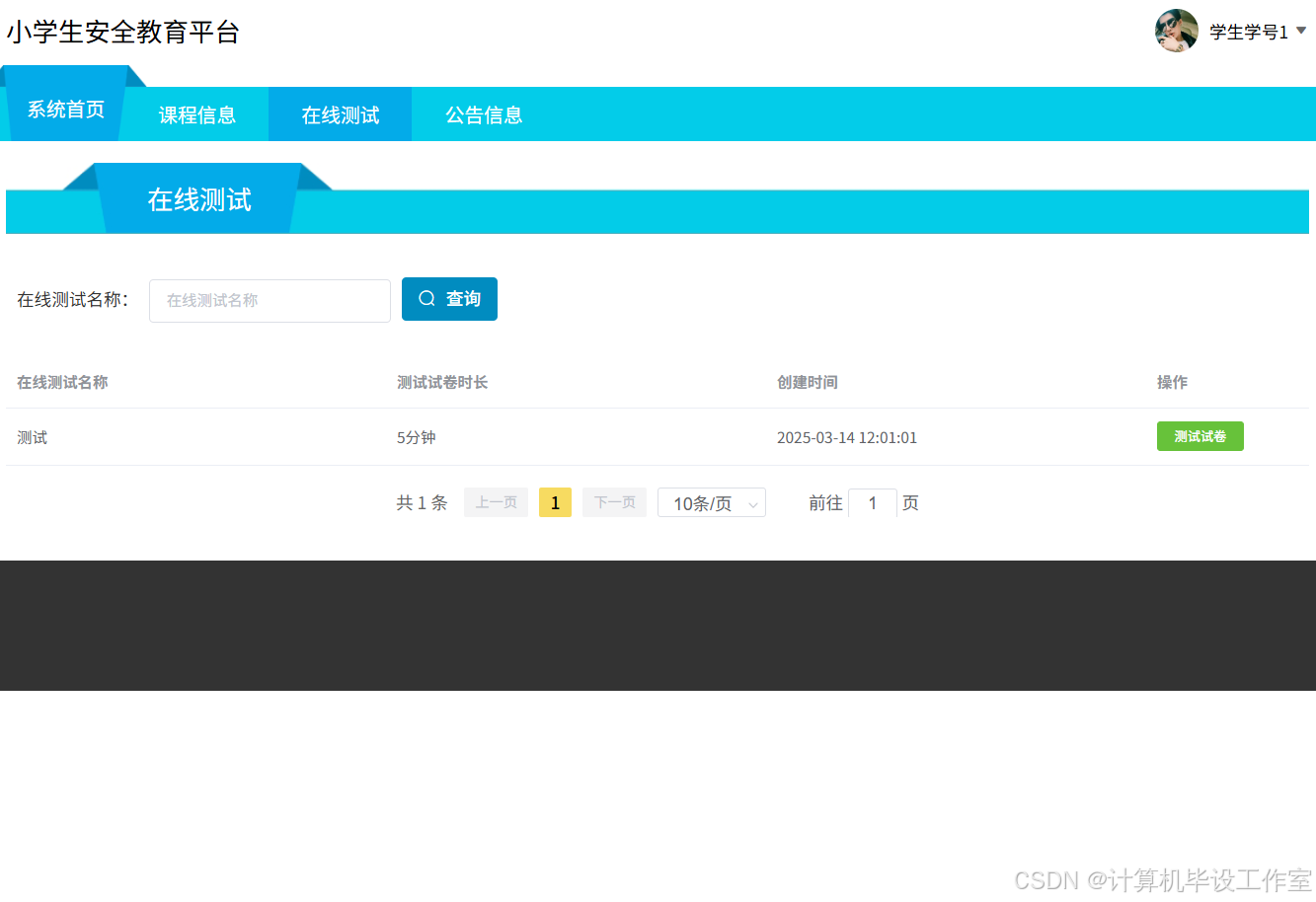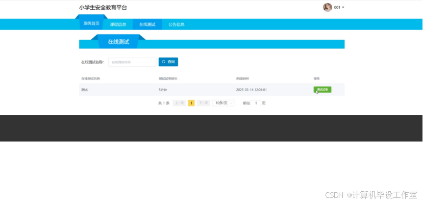 在线测试模块允许前台用户查看在线测试列表,可按在线测试名称进行查询,点击测试试卷,可进行答题,答题完成后提交可查看解析和分数。