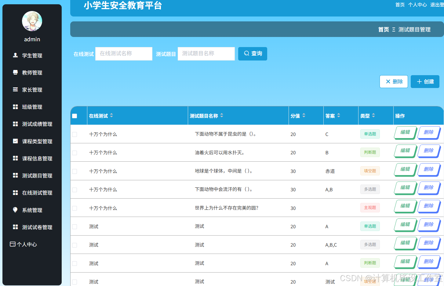教师可以通过测试题目管理模块,查看题目信息列表,可以根据在线测试名称、测试题目名称进行查询,可对现有的题目内容进行编辑修改或删除。也可填写测试题目、选择在线测试名称、类型(如单选题、多选题、判断题等),添加选项、填写答案、分析、分数和排序,创建新的测试题目。管理员也具有查看、创建和管理的功能。