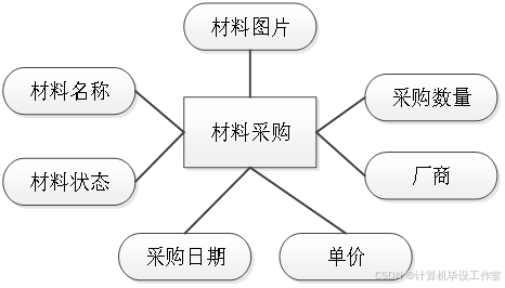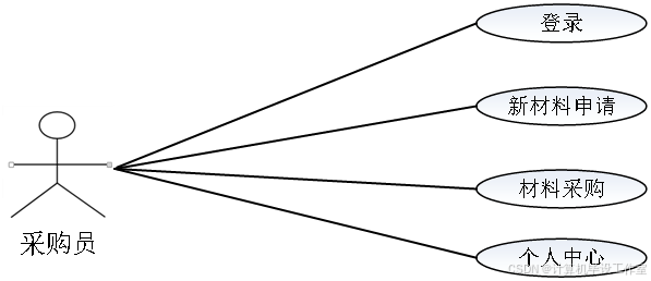 采购员点击个人账户和输入密码登录系统,可以查看新材料申请详情以及进行材料采购操作,在采购页面输入具体的采购材料以及数量提交,可以在个人中心中修改个人资料。采购员用例图如图3-1所示。