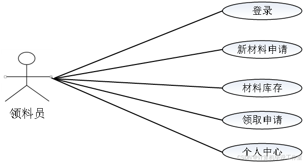 领料员登录后,可以查看材料库存明细,进行领取申请,提交具体的申请单,以及提交新材料的领取申请,等待管理者的审核,还可以在个人中心进行个人资料信息的修改。领料员用例图如图3-2所示。