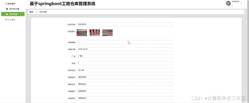 采购员点击个人账户和输入密码登录系统,可以查看新材料申请详情以及进行材料采购操作,在采购页面输入具体的采购材料以及数量提交,可以在个人中心中修改个人资料。(2)领料员功能