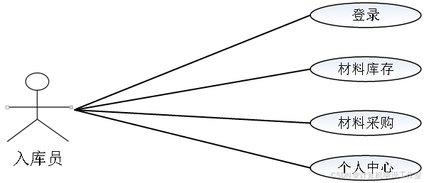 入库员登录后,可以查看材料库存明细,可以对采购的材料进行入库操作,还可以在个人中心中进行个人信息资料的修改。入库员用例图如图3-4所示。