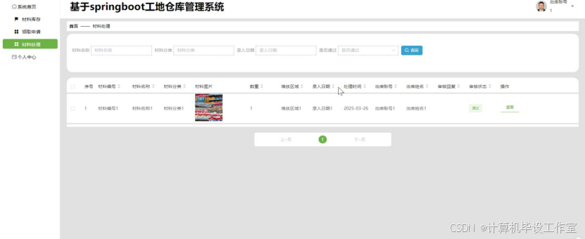 项目经理点击材料处理界面中可以查看出库员上传的待处理材料清单,负责核实情况后进行审核通过。材料处理界面如图5-11所示。