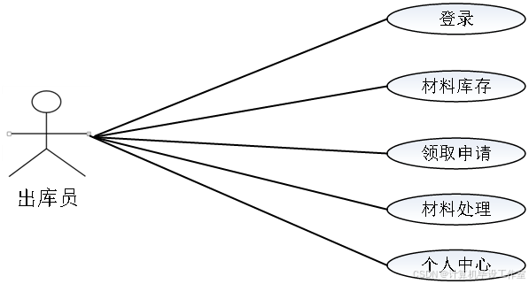 出库员登录后,可以查看材料库存明细,可以对领料员上传的领取申请进行审核处理,还可以提交材料处理申请至系统。出库员用例图如图3-3所示。