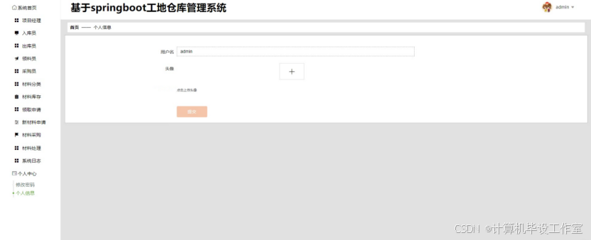 入库员登录后,可以查看材料库存明细,可以对采购的材料进行入库操作,还可以在个人中心中进行个人信息资料的修改。(5)项目经理功能