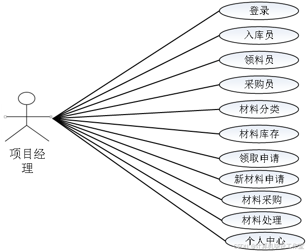 项目经理登录后,主要功能包括入库员、出库员、领料员、采购员用户的管理,进行材料分类,管理材料库存,查看领取申请,以及审核新材料申请,审核材料采购以及材料处理。项目经理用例图如图3-5所示。