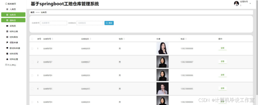 项目经理可以对系统中的出库员用户信息进行维护管理。出库员界面如图5-9所示。