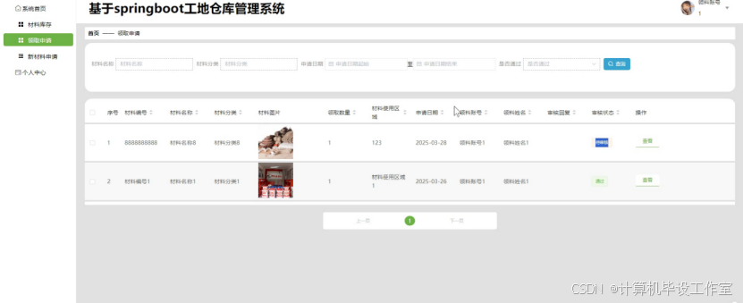 项目经理有权限在领取申请界面中查看材料领取申请单,对不同的申请资料进行审核通过。领取申请界面如图5-10所示。