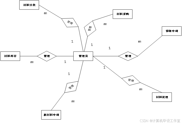 管理员登录后,主要功能包括项目经理、入库员、出库员、领料员、采购员用户的管理,进行材料分类,管理材料库存,查看领取申请,以及审核新材料申请,审核材料采购以及材料处理、系统日志等。管理员用例图如图3-6所示。