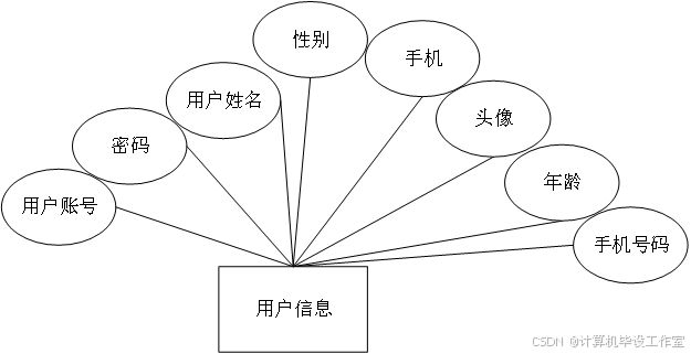 用户信息实体包括用户账号、密码、用户姓名、性别、手机、头像这些属性,用户信息实体图如图4-4所示。