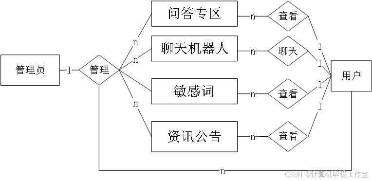各实体间的关系通过对应属性关联:管理员与四个业务实体均为一对多的管理关系,即一个管理员可管理多条问答、多个敏感词等;用户与问答专区是一对多的发布关系,与聊天机器人是一对多的聊天关系,与敏感词、资讯公告则是一对多的查看关系,以此构建出覆盖系统业务流程的概念结构,为后续逻辑结构设计提供基础。
