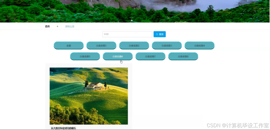 用户首页模块的页面呈现上,顶部设有“首页”“资讯公告”的导航选项,中间区域包含搜索框与多个分类标签按钮,下方展示了带有配图和文案的内容卡片。作为用户角色,在这个模块中可以通过搜索框输入标题关键词进行内容搜索,也能点击不同的分类名称按钮筛选对应类别的内容,同时可以浏览页面展示的内容卡片信息。首页模块界面图如图5-4所示。