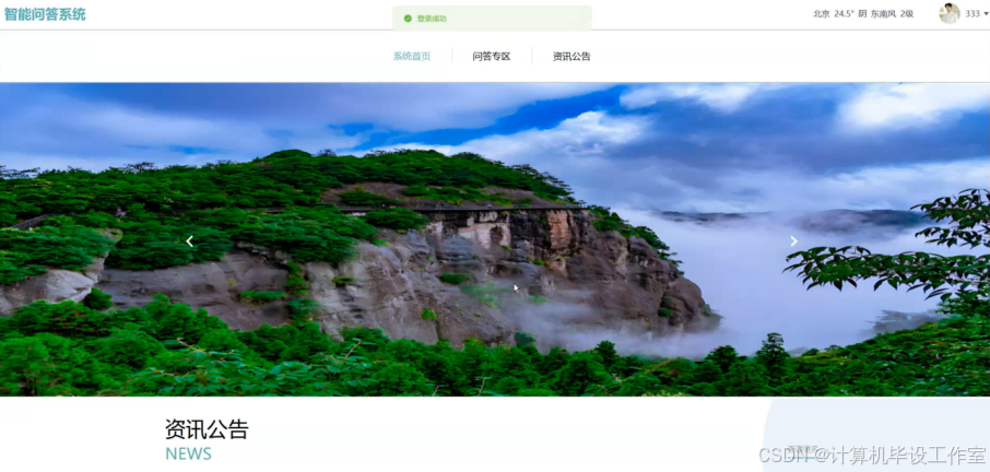 用户资讯公告模块的页面顶部有“系统首页”“问答专区”“资讯公告”的导航栏,中间是占据较大区域的轮播图展示区域,下方则是“资讯公告”的标题板块及“查看更多”按钮。用户在这个模块可以通过导航栏在不同页面间切换,浏览轮播图展示的内容,还能点击“查看更多”按钮去查看更多的资讯公告信息。资讯公告模块界面图如图5-6所示。