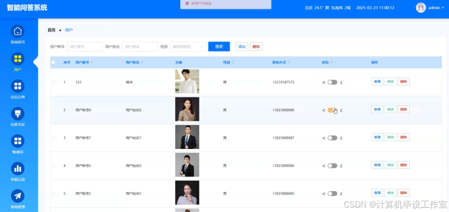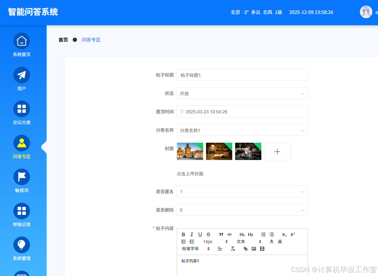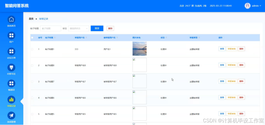 (2)管理员角色对应的功能模块包含系统首页、用户、论坛分类、问答专区、敏感词、举报记录、系统管理等。用户模块用于管理员对平台用户进行增删改查及状态管理;论坛分类模块可能是对问答内容的分类进行管理;问答专区模块支持管理员对问答帖子进行检索、删除、置顶等管理操作;敏感词模块或许是对平台内容中的敏感词汇进行管理;举报记录模块用于管理员处理平台内的举报内容;系统管理模块可能涉及平台整体设置等内容,这些模块共同支撑管理员对平台进行全面的管理与维护