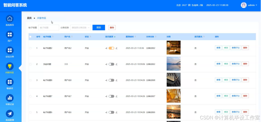 管理员问答专区管理模块的页面左侧是导航栏,主区域上方有帖子标题、分类名称的筛选条件及“搜索”“删除”按钮,下方是帖子列表,每条帖子包含标题、用户名、状态等信息,还有“是否置顶”开关及“查看”“修改”等操作按钮。管理员在这个模块能够通过筛选条件搜索帖子,点击“删除”按钮删除帖子,操作“是否置顶”开关来设置帖子是否置顶,同时可以对帖子进行查看、修改、查看评论等操作。问答专区管理模块界面图如图5-2所示。
