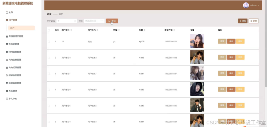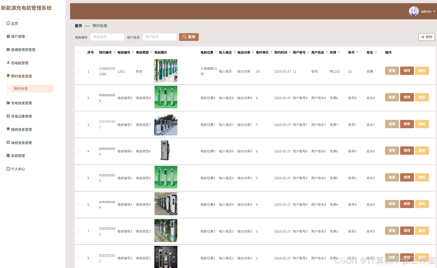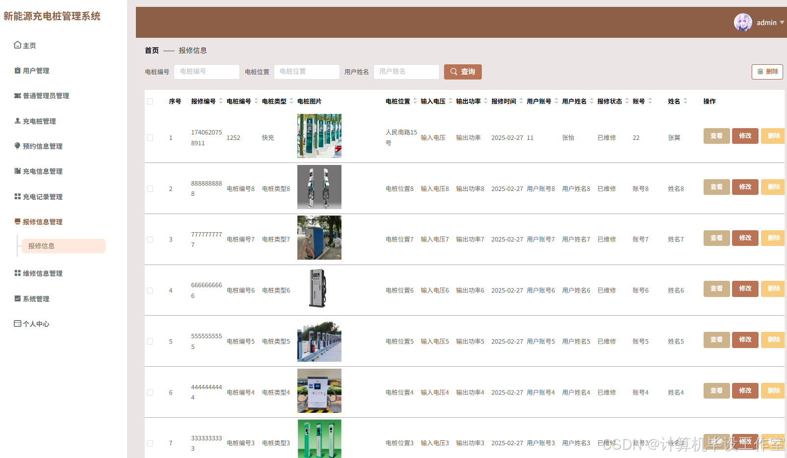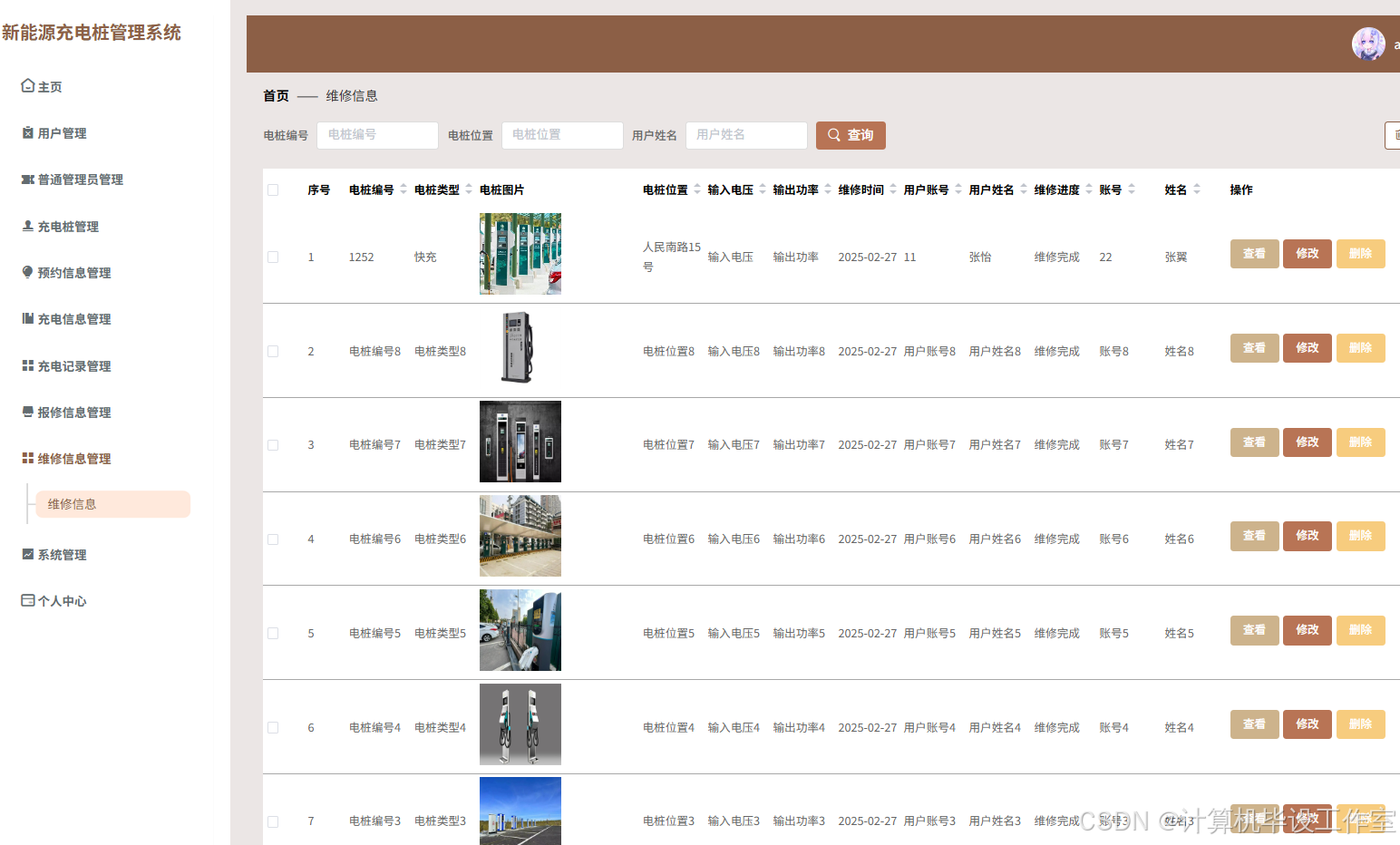 普通管理员充电桩管理功能是对充电桩信息的集中管控模块,界面呈现充电桩列表,包含序号、电桩编号、电桩类型、电桩图片、位置、输入电压、输出功率、每度单价、状态等信息,还关联了对应账号与姓名。支持通过电桩编号、电桩类型、电桩位置等条件进行查询,快速定位目标充电桩;同时配备添加按钮可新增充电桩信息,也能对已有充电桩执行查看详情、修改信息、删除记录的操作,灵活维护充电桩数据。此外,列表支持批量删除功能,可一次性清理多个无效充电桩信息,搭配分页控件能按需展示数据量。该功能通过清晰的信息展示与多样化的操作选项,实现对充电桩信息的高效管理,保障充电桩数据的准确与运营的有序。如图5-3所示。