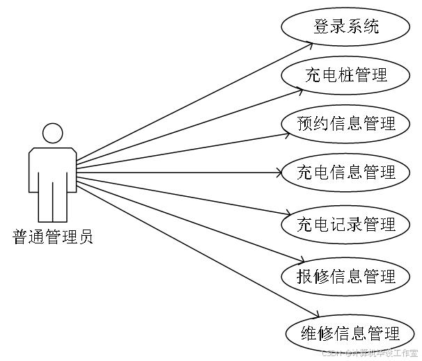 普通管理员是新能源充电桩管理系统的业务执行角色,其用例聚焦于充电桩运营相关的实操性管理功能:首先需通过登录系统进入操作界面,随后开展充电桩管理工作,维护充电桩的基础信息、实时监控设备运行状态;同时负责预约信息管理,处理用户提交的充电预约申请,协调不同时段的充电桩使用安排;还需管理充电信息与充电记录,跟踪当前充电进程的数据动态,并留存、统计历史充电记录以支持后续查询。在运维服务环节,普通管理员要承接报修信息管理,接收用户反馈的充电桩故障信息并进行初步核实与登记,同时跟进维修信息管理,对接运维资源、记录维修进度与结果,确保故障设备及时恢复使用。整体而言,普通管理员的用例覆盖了充电桩从日常运营、预约调度到故障报修与维修跟进的核心业务流程,是系统中衔接用户需求与设备运维的关键执行角色,通过这些操作保障充电桩服务的有序运转。普通管理员用例如图3-2所示。