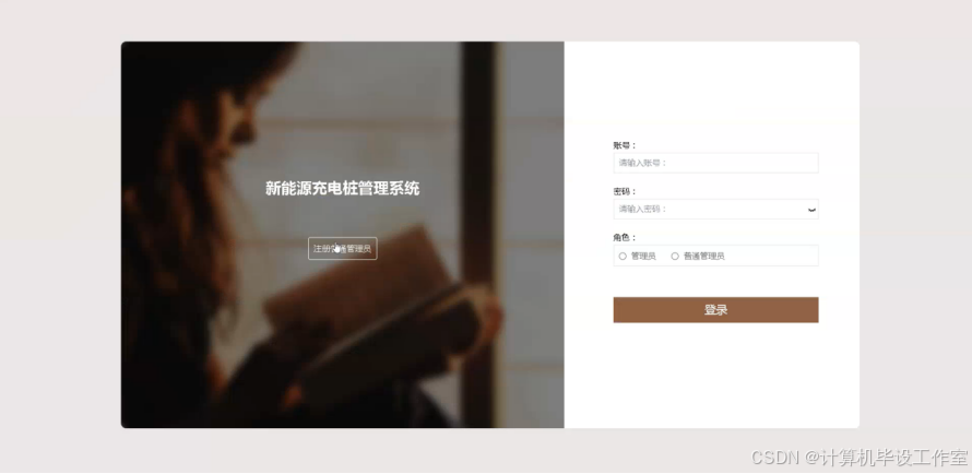 管理员登录功能是进入新能源充电桩管理系统的入口环节。界面呈现系统名称,同时设置账号、密码输入框,以及管理员、普通管理员的角色选择项,还配备注册与登录按钮。用户需在对应输入框填写账号、密码,并选择对应角色类型,点击登录按钮后,系统会校验账号、密码的正确性及角色权限的匹配性,验证通过则进入对应角色的系统操作界面,验证失败则提示错误信息。该功能通过身份与权限的双重校验,保障系统仅授权用户可进入,同时清晰的界面布局让登录操作更便捷,为系统后续管理功能的使用提供安全、高效的准入支撑。如图5-1所示。