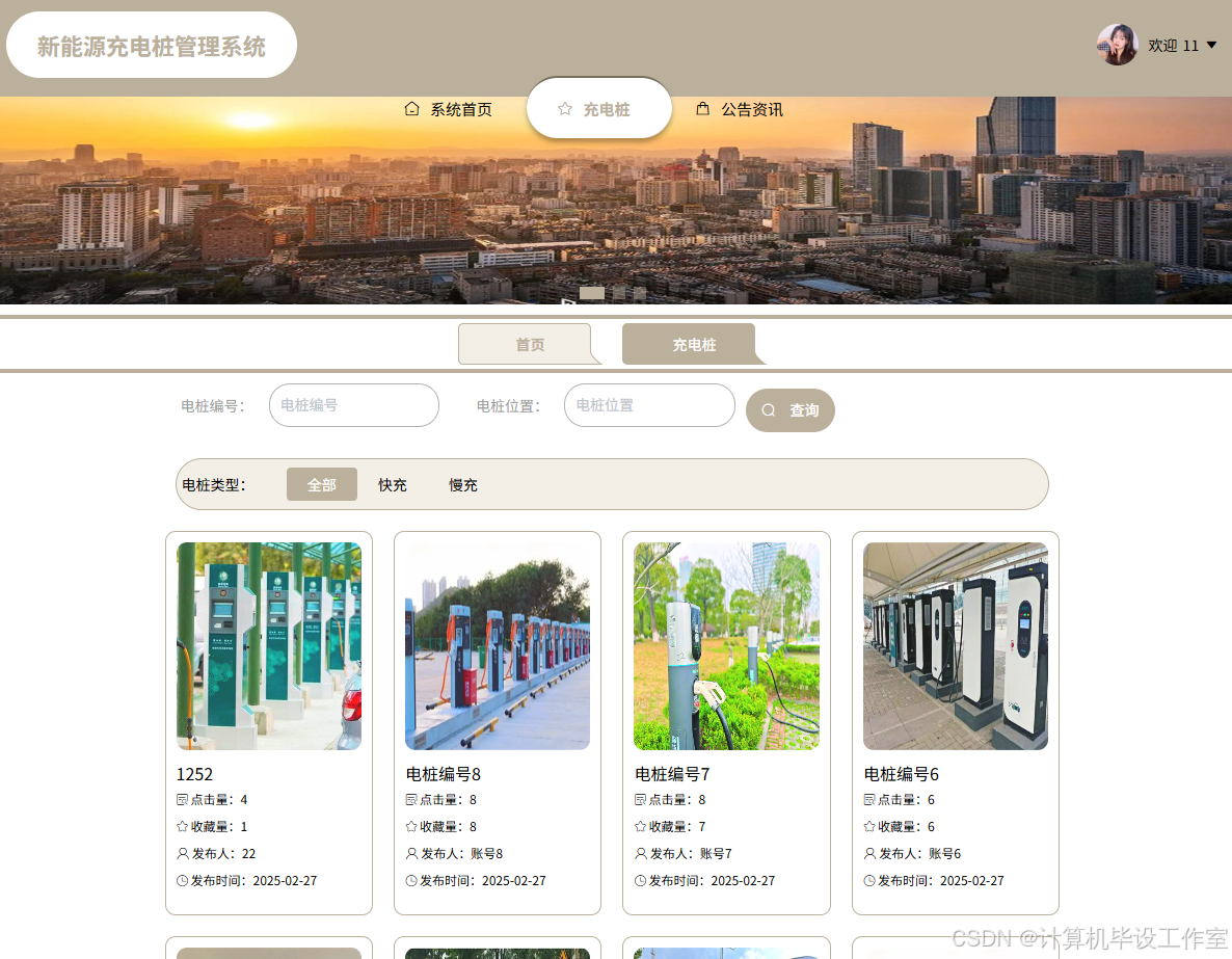 本系统设计与实现了新能源充电桩管理系统,后端采用Java结合Spring Boot框架搭建稳定高效的服务端,搭配MySQL数据库完成数据的存储与管理,前端构建交互简洁的Web操作界面。实现了用户管理、充电桩管理、预约/充电信息管理、充电记录管理、报修/维修信息管理等核心功能,支持管理员对充电桩全生命周期、用户服务流程进行统筹管控,打通充电桩运营、服务、运维的信息链路。