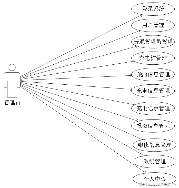 管理员作为新能源充电桩管理系统的核心操作角色,其用例覆盖系统全流程的管理功能:首先需通过登录系统进入操作界面,之后可开展用户管理相关操作,对系统内的用户信息进行维护;同时负责普通管理员管理,统筹该类角色的权限与信息。在核心业务层面,管理员需进行充电桩管理,把控设备的基础信息与运行状态;处理预约信息管理,统筹用户的充电预约需求;管理充电信息与充电记录,跟踪充电过程数据并留存历史记录。针对运维环节,管理员要负责报修信息管理,接收并处理用户提交的故障报修申请,同时跟进维修信息管理,协调运维资源推进故障设备的维修流程。此外,管理员还承担系统管理职责,维护系统的基础配置与运行参数,也可通过个人中心管理自身账号信息,整体形成对系统用户、设备、业务、运维及自身账号的全维度管理闭环。管理员用例如图3-1所示。